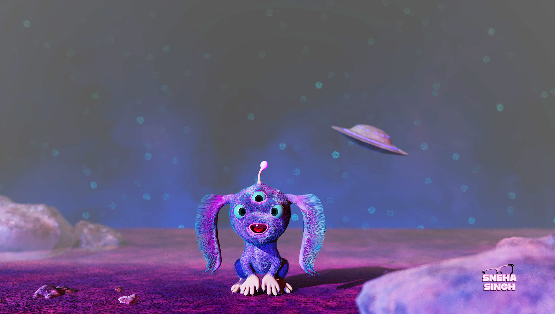 A stylized, furry alien character modeled in Maya, textured in Substance Painter, and groomed with Xgen.