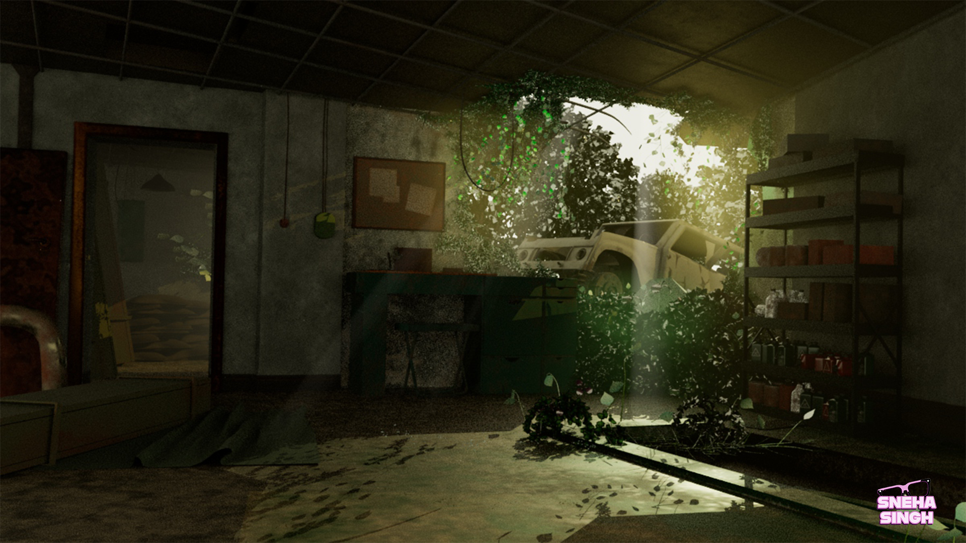 A detailed post-apocalyptic garage scene crafted in Maya, textured in Substance Painter, and rendered with a cinematic touch.